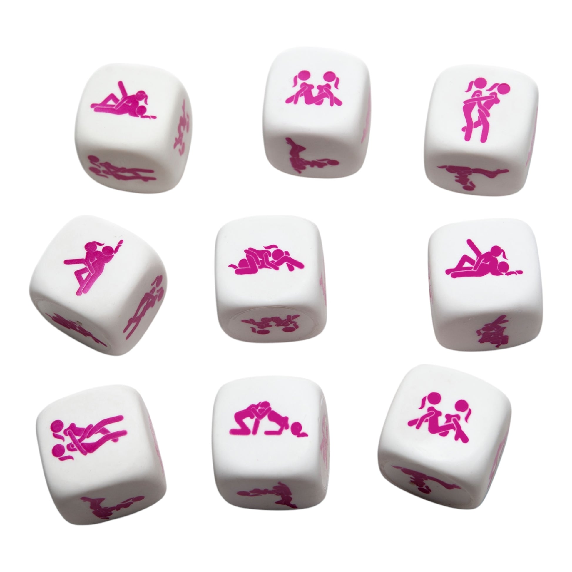 - Design: White dice with vibrant pink illustrations.