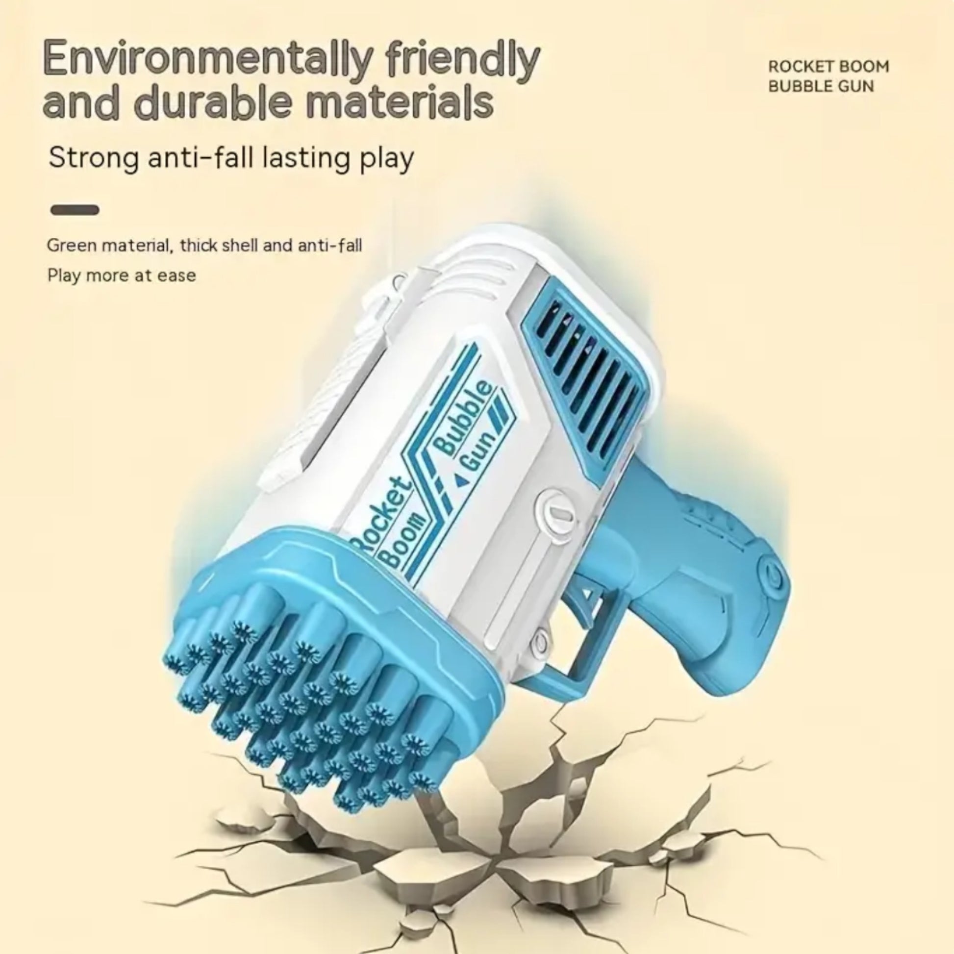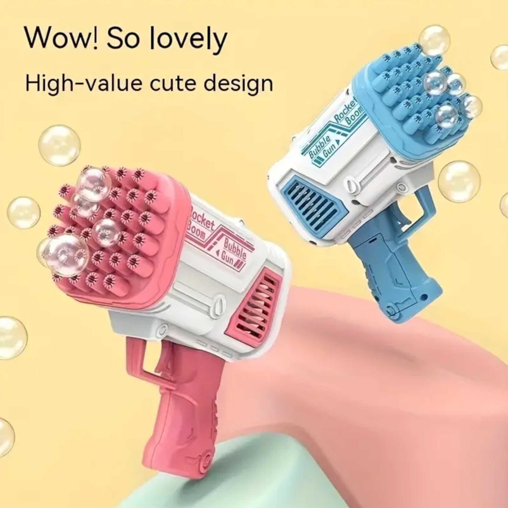 - Design: Rocket-shaped bubble gun