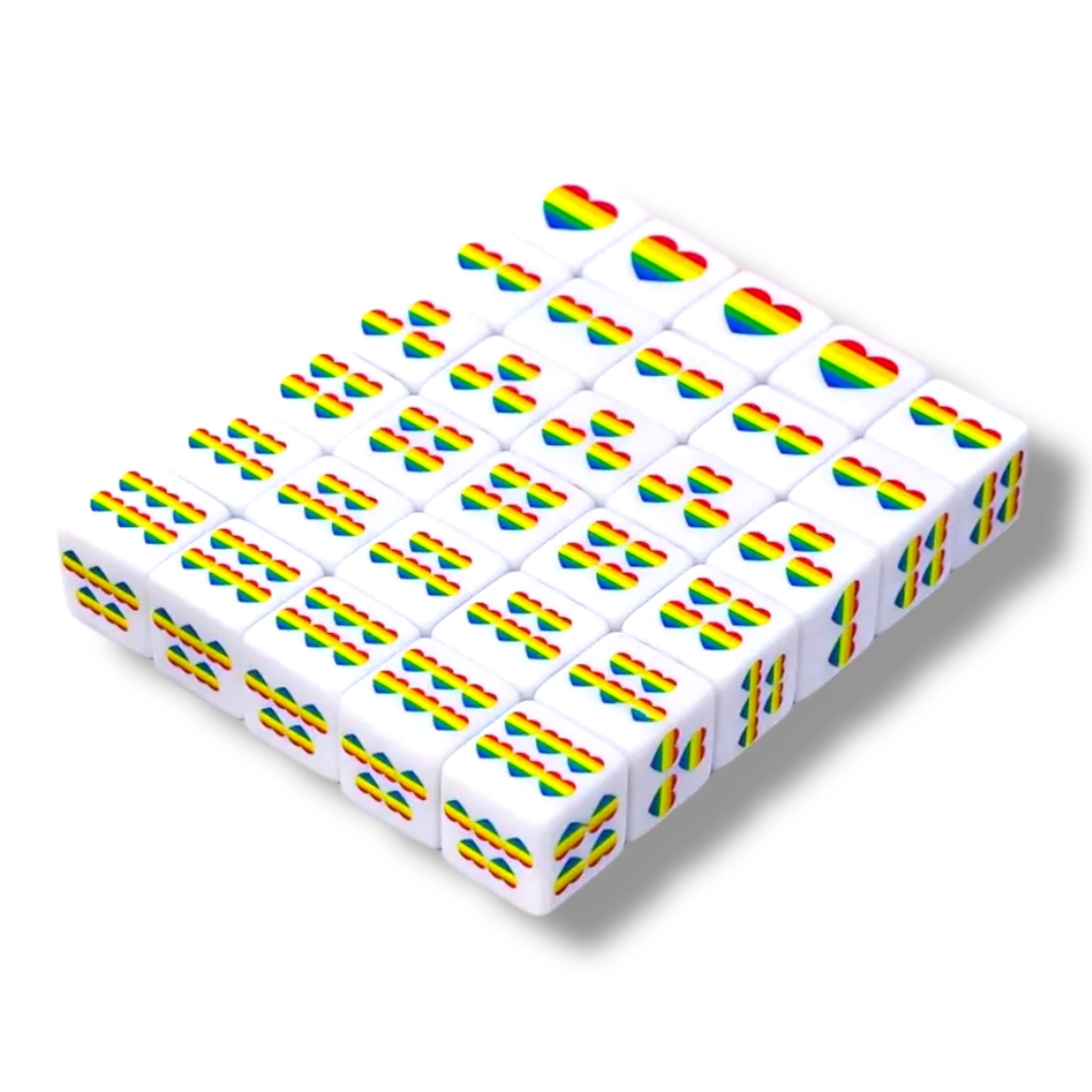 Color: White dice with rainbow heart print