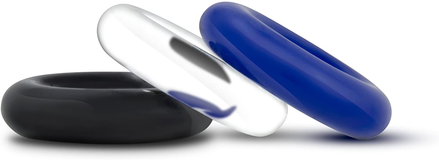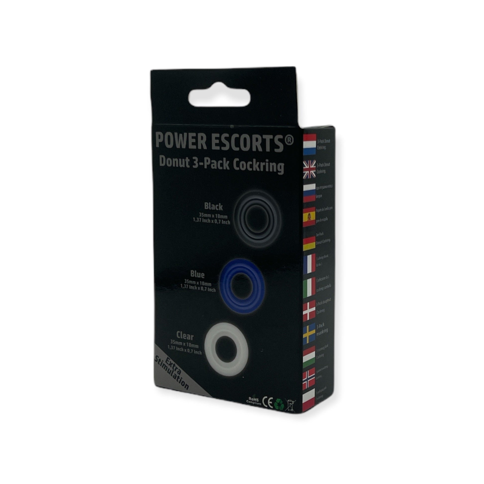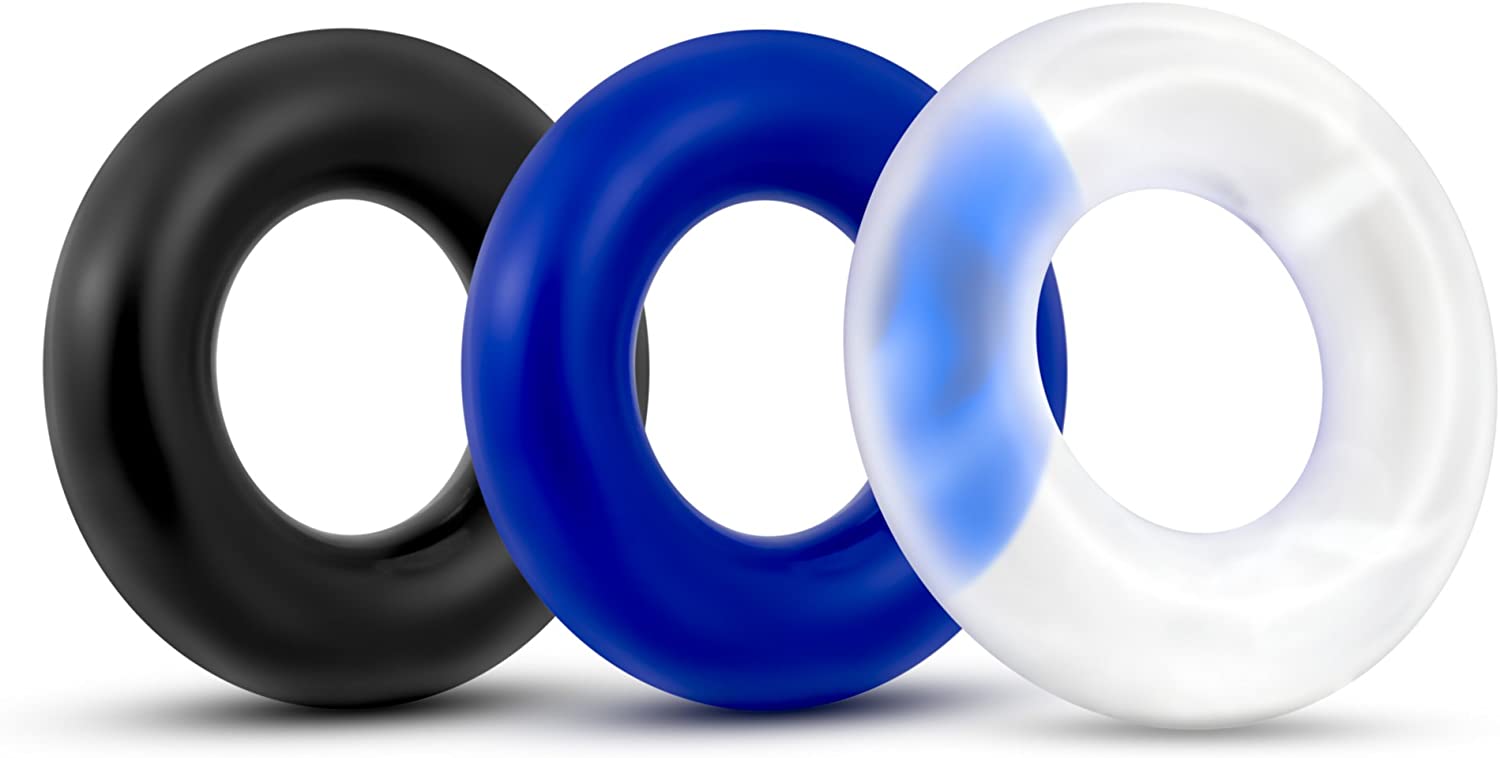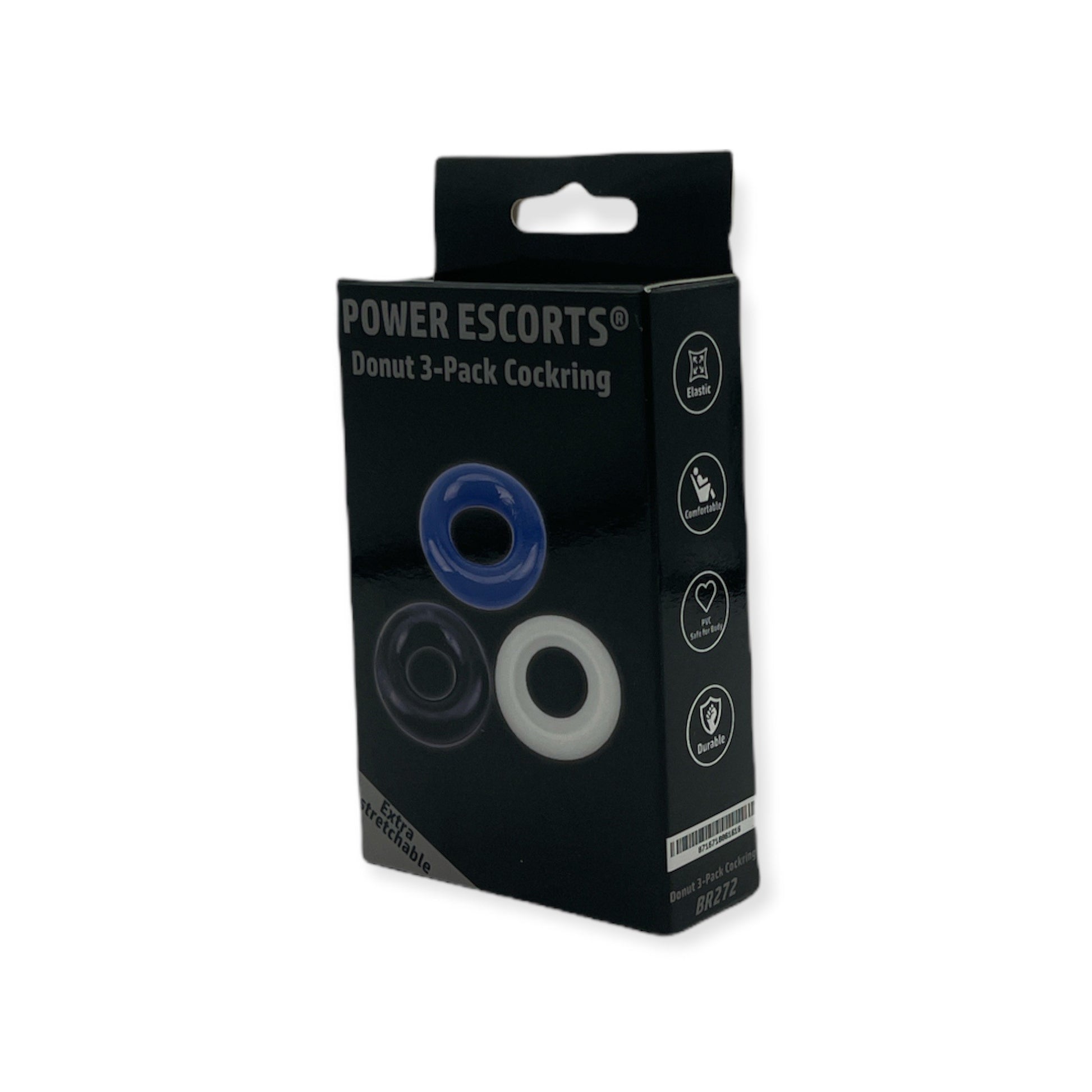 Power Escorts - BR272 - Donut Cockring 3 Pack - Super Stretchable - 3 colors blue /clear /black - attractive colourbox