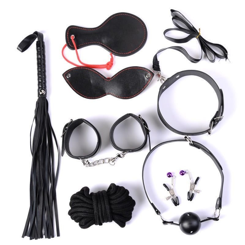 Power Escorts - Fetish Power - 8-Piece Bondage Set - BDSM Bondage Kit - Beginner Set With Nipple Clamps, Collar, Handcuffs, Rope, Mask, Whip & Ball Gag - BR91 - Black