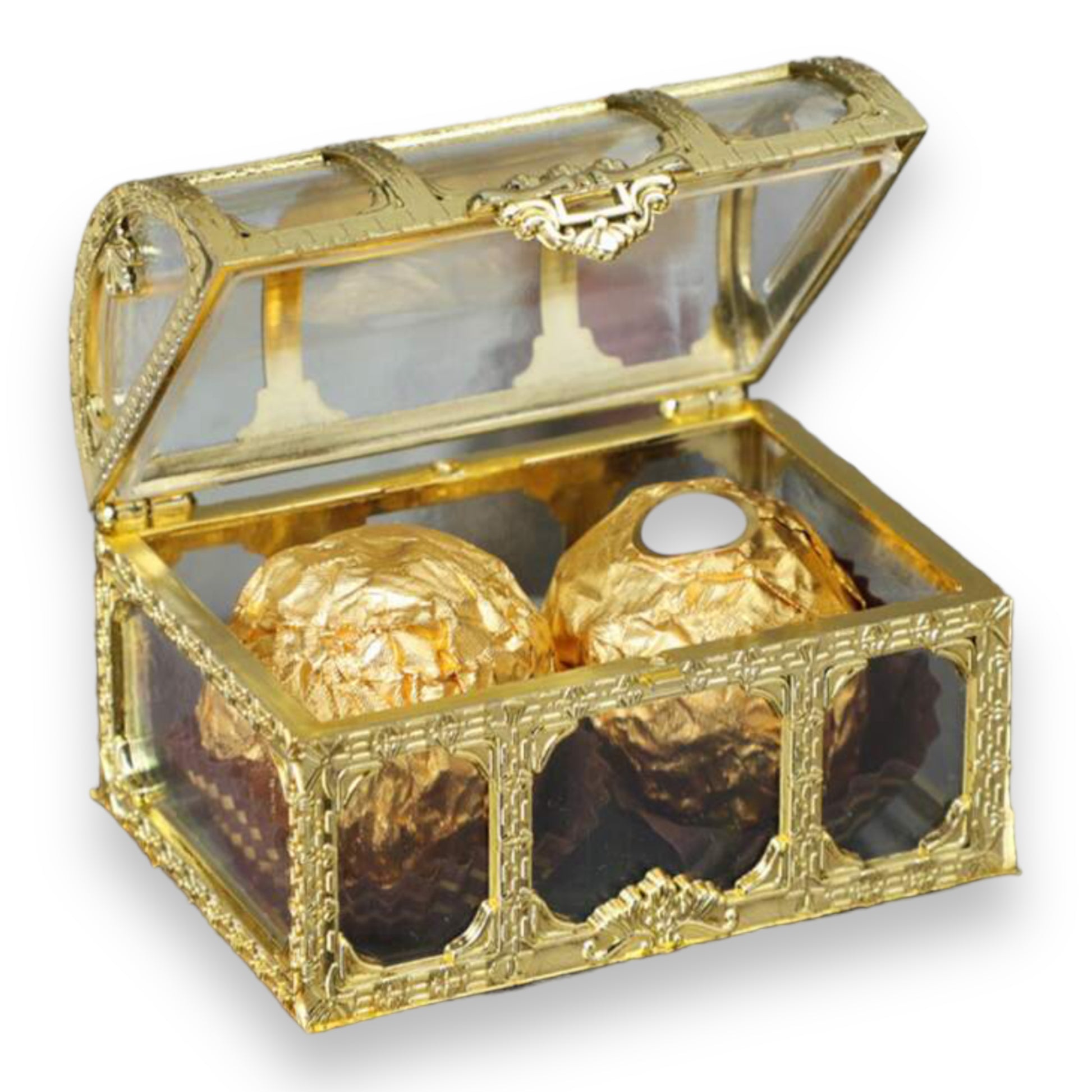 Captivating Gold Design: The treasure box boasts a luxurious gold exterior that gleams with opulence. Its ornate details and rich color make it a stunning addition to any setting.