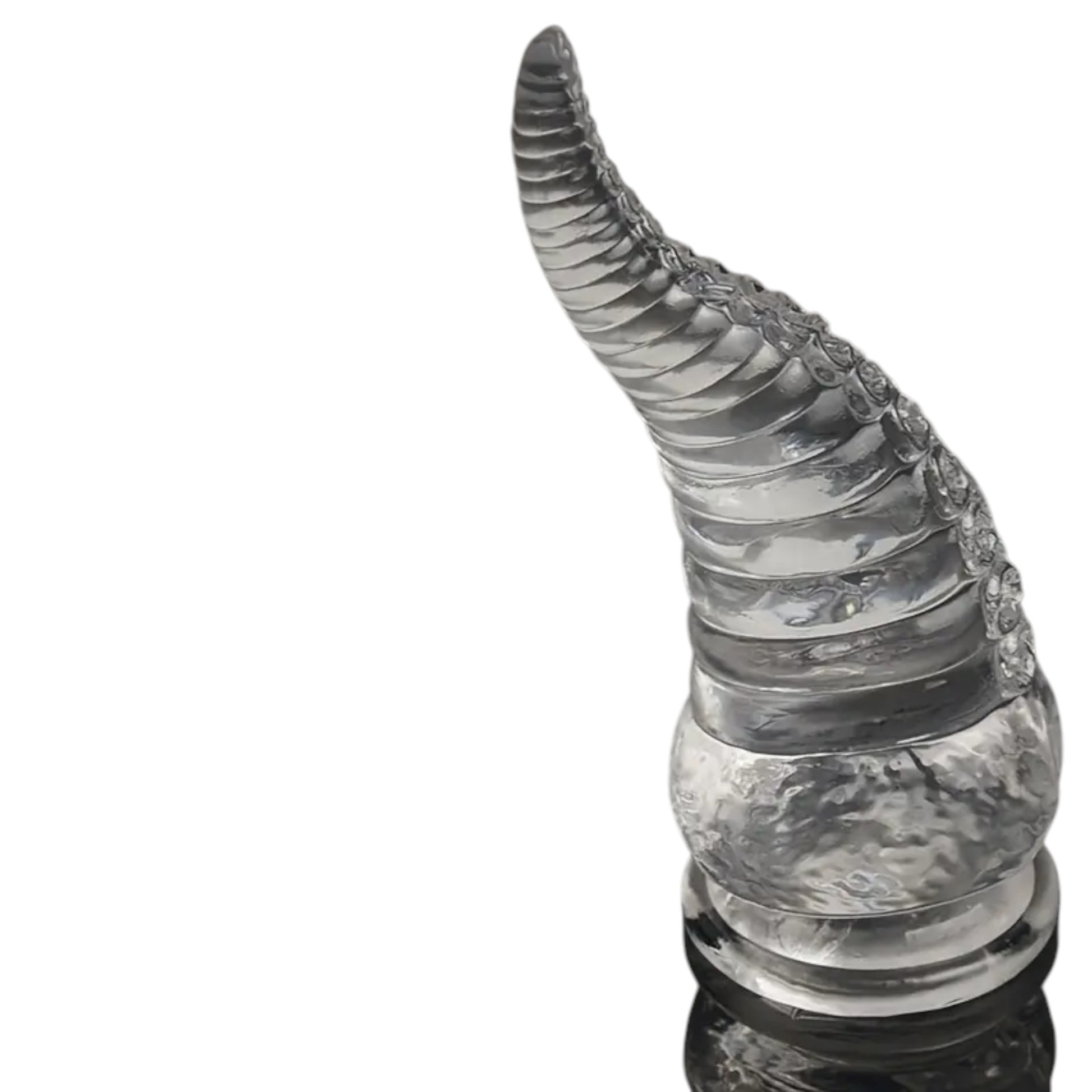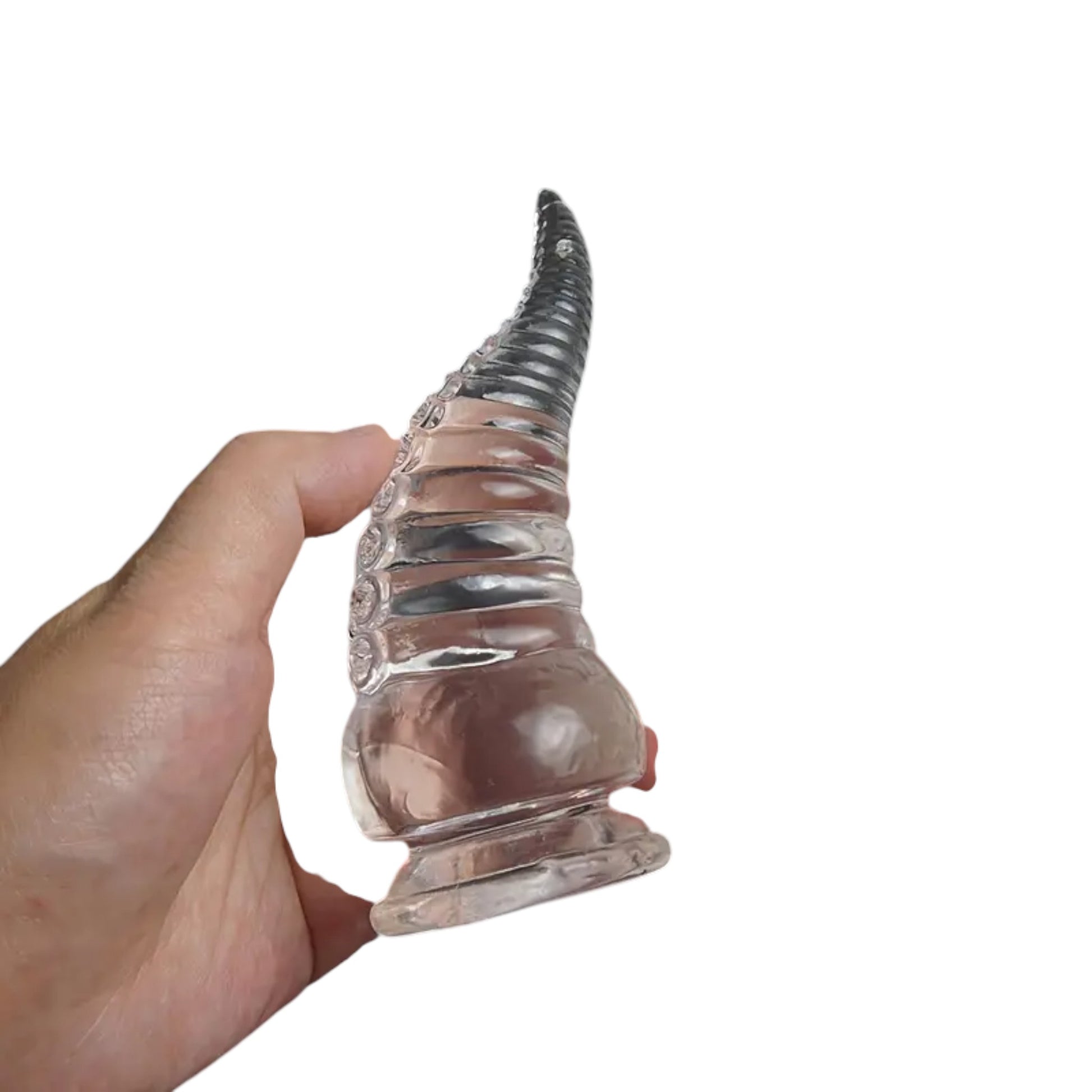Experience intense, fantasy-inspired pleasure with this 16 cm transparent curved dildo, designed with bold ribbing and a flexible, body-safe texture. The pronounced curve targets internal stimulation, while the spiral ridges add extra sensation with every movement.
